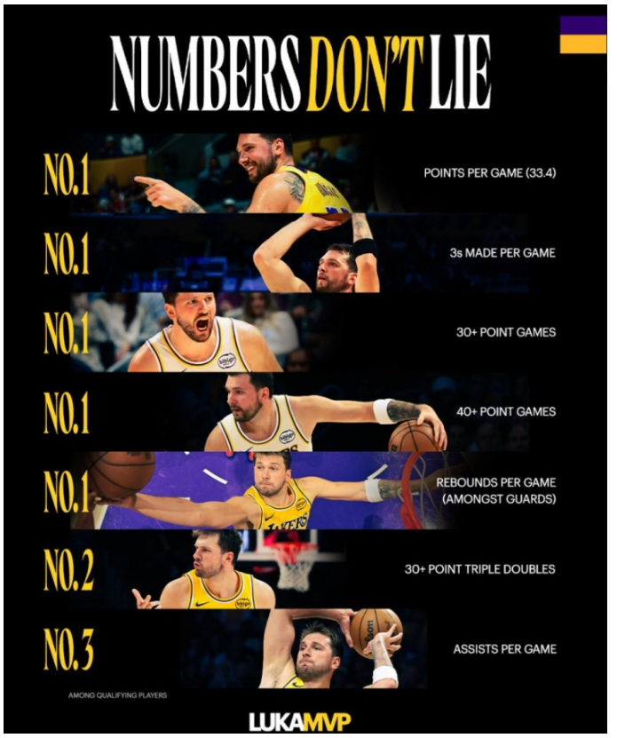 • 东契奇得分/三分/30+40+场次全联盟第一 湖人官推:数据不说谎